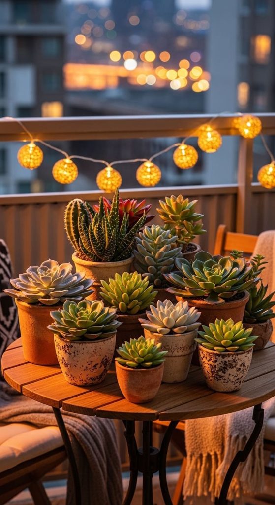 Small balconies benefit from subtle decor. Place artificial succulents on a small coffee table for a minimalist touch.