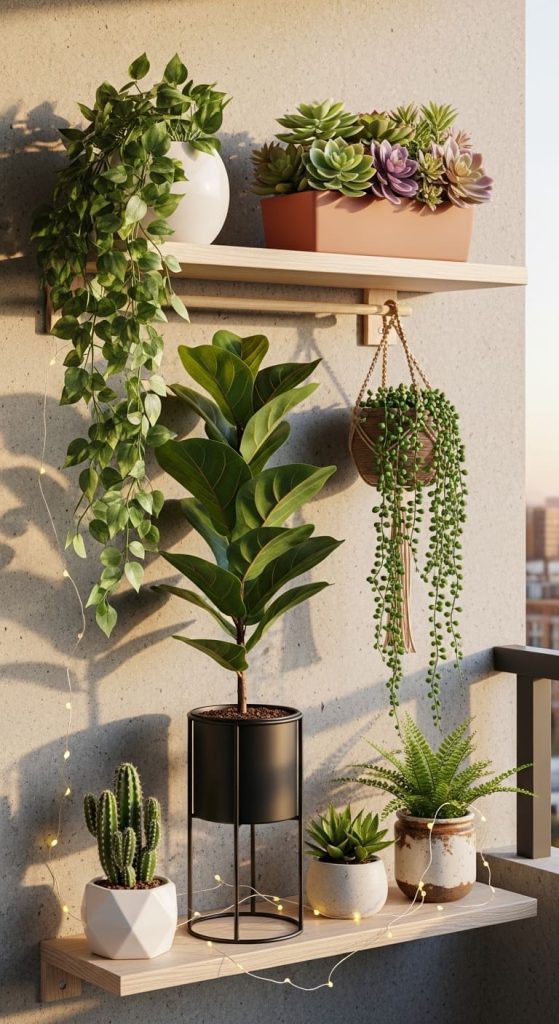 6. Balcony Shelf Styling with Faux Plants