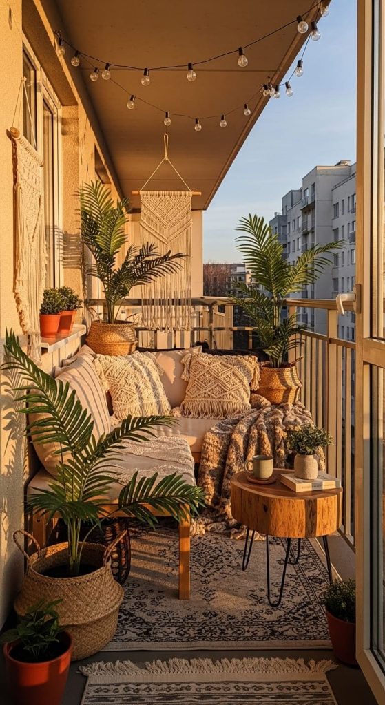 This works beautifully for small balconies that feel cold or unfinished.