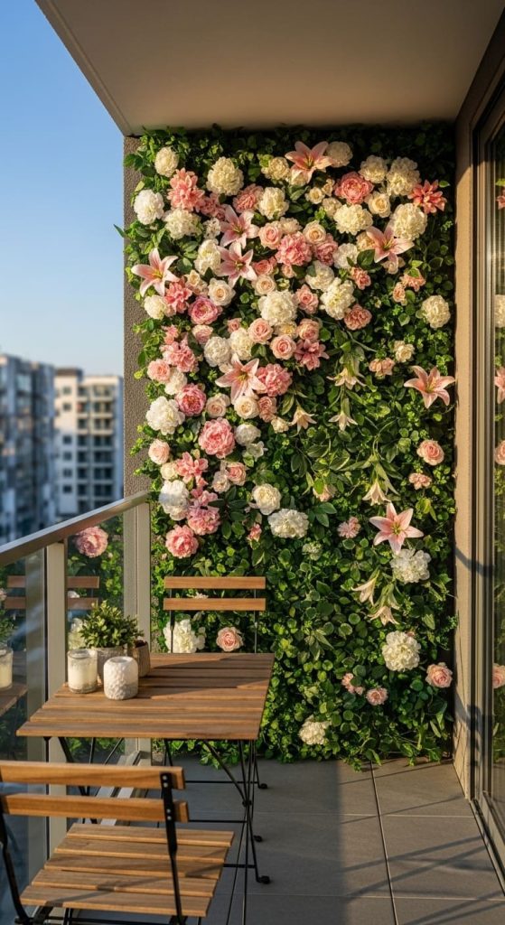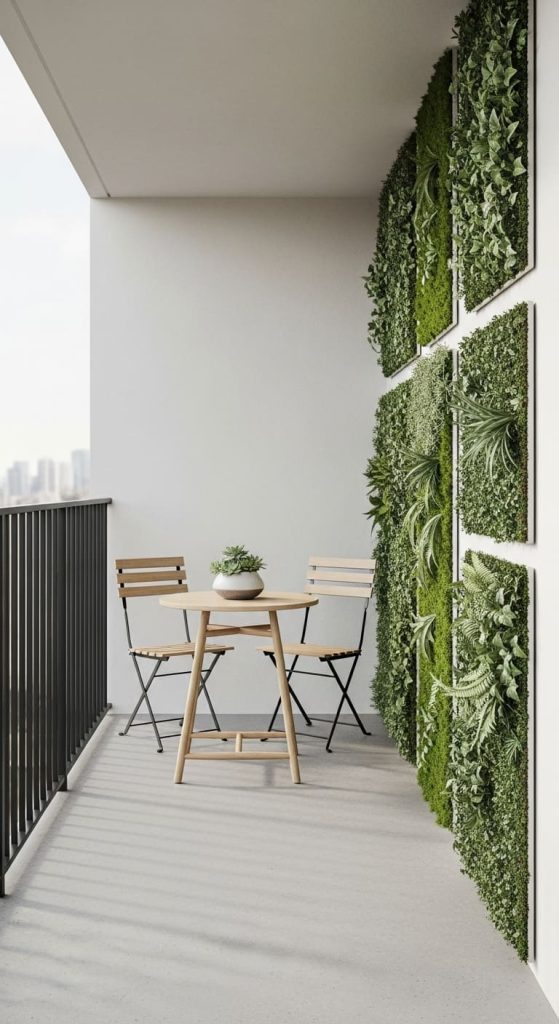 If your balcony is narrow, think vertically. Install faux greenery panels on one wall to create a lush backdrop.